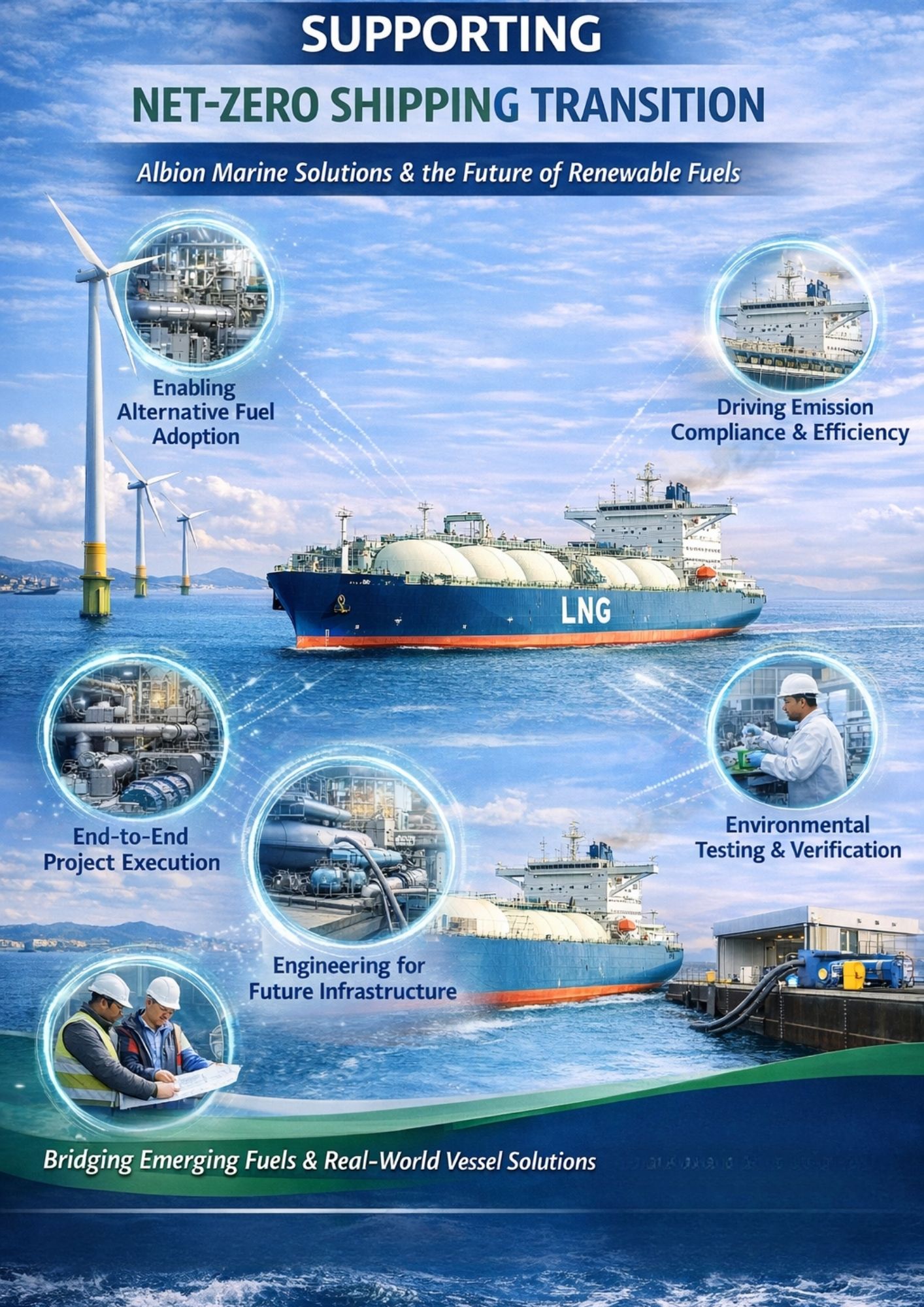 These services support audit readiness and certification requirements across global operations. Engineering for Future Infrastructure The shift toward renewable fuels also demands readiness in both onboard systems and port infrastructure. Albion supports this evolution with:
